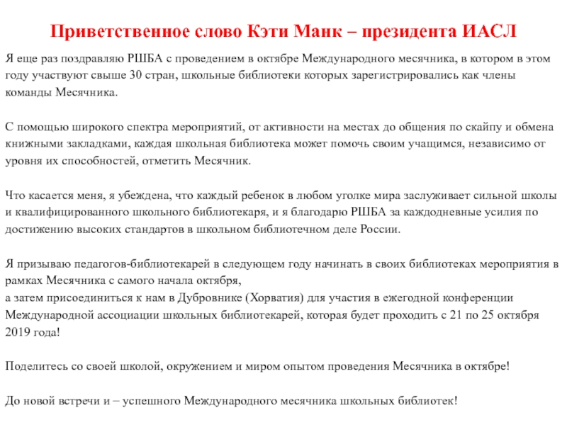 Слайд 10Приветственное слово Кэти Манк – президента ИАСЛ