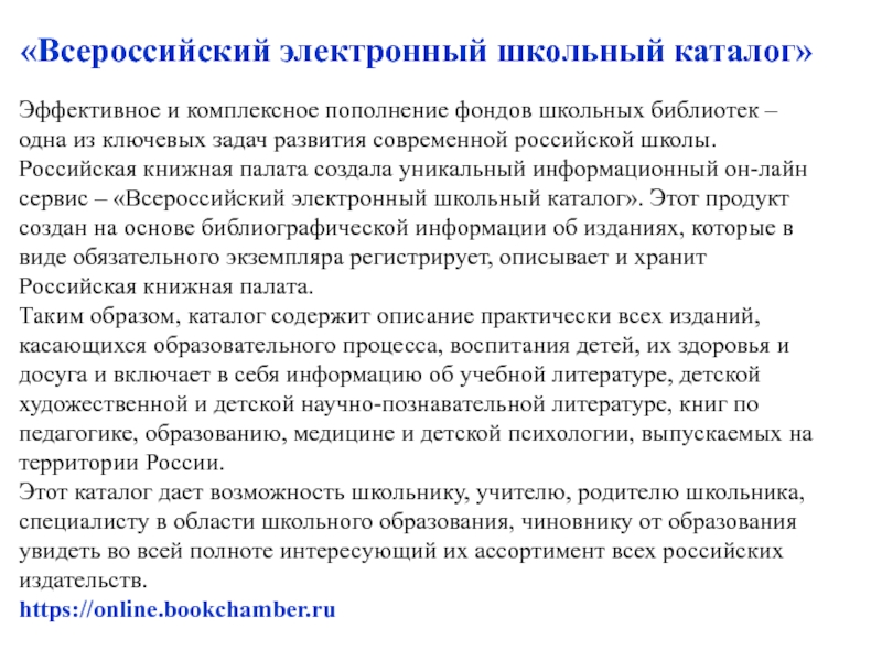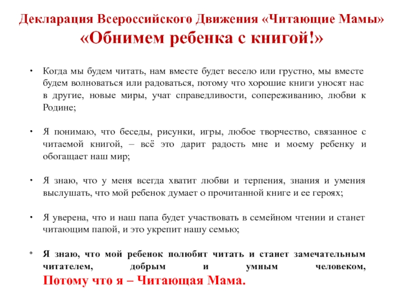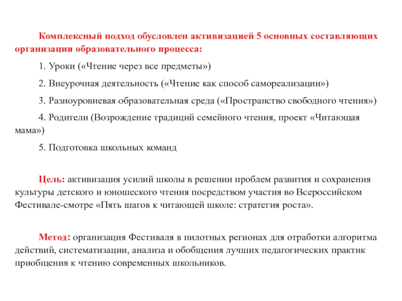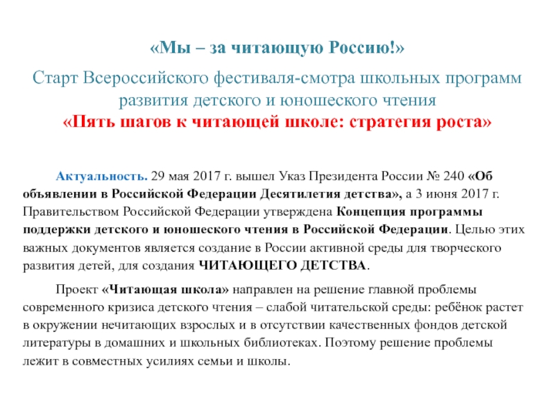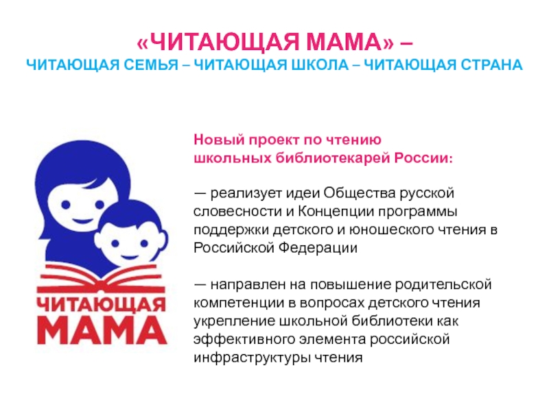 — направлен на повышение родительской компетенции в вопросах детского чтения укрепление школьной библиотеки как эффективного элемента российской инфраструктуры чтения