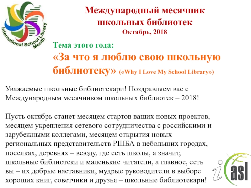 IASL «Инновации, информация и влияние школьных библиотек». В этом году мы сосредоточили внимание на влиянии школьных библиотек и выбрали формулировку, которая, по нашему мнению, будет интересна всем нашим участникам. Мы приглашаем их отметить ISLM-2018 и, поучаствовав в проектах и мероприятиях, рассказать о том, почему они любят свою школьную библиотеку. Мы надеемся, что в этом году Международный месячник школьных библиотек станет настоящей одой радости и любви всем школьным библиотекам.