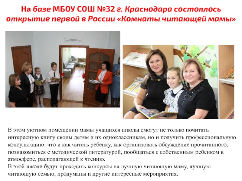 В этой школе будут проходить конкурсы на лучшую читающую маму, лучшую читающую семью, продуманы и другие интересные мероприятия.
