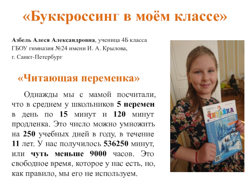 Однажды мы с мамой посчитали, что в среднем у школьников 5 перемен в день по 15 минут и 120 минут продленка. Это число можно умножить на 250 учебных дней в году, в течение 11 лет. У нас получилось 536250 минут, или чуть меньше 9000 часов. Это свободное время, которое у нас есть, но, как правило, мы его не используем.