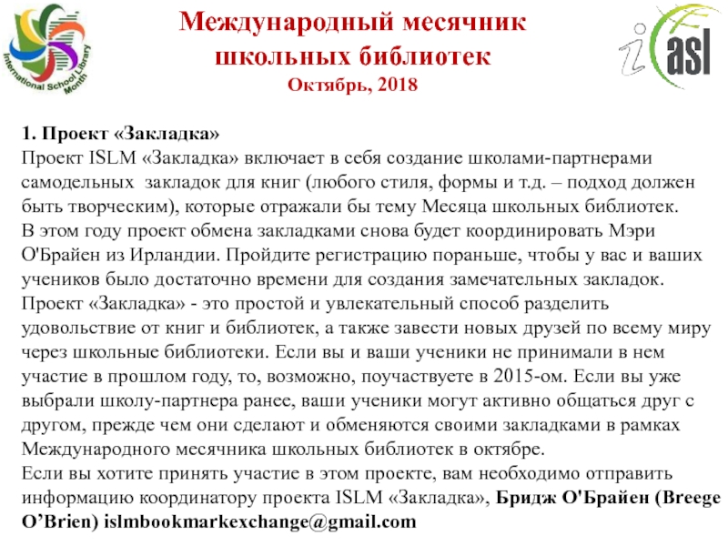 Если вы хотите принять участие в этом проекте, вам необходимо отправить информацию координатору проекта ISLM «Закладка», Бридж О'Брайен (Breege O’Brien) islmbookmarkexchange@gmail.com
