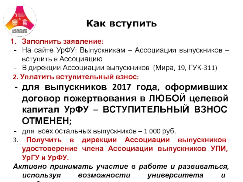 Организация деятельности – дирекция (Центр по развитию партнерства с выпускниками УрФУ )