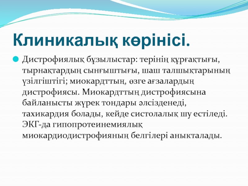 кейде систолалық шу естіледі. ЭКГ-да гипопротеинемиялық миокардиодистрофияның белгілері аныкталады.