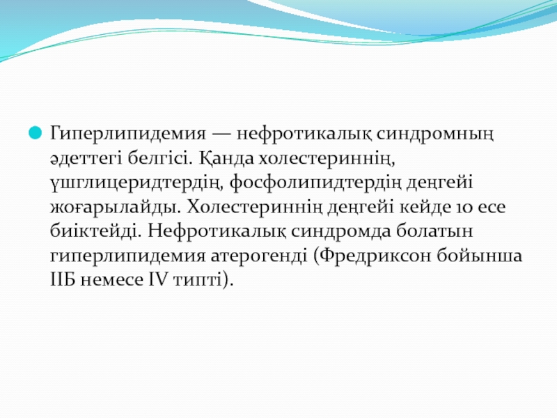 Слайд 16Гиперлипидемия — нефротикалық синдромның әдеттегі белгісі. Қанда холестериннің, үшглицеридтердің, фосфолипидтердің
