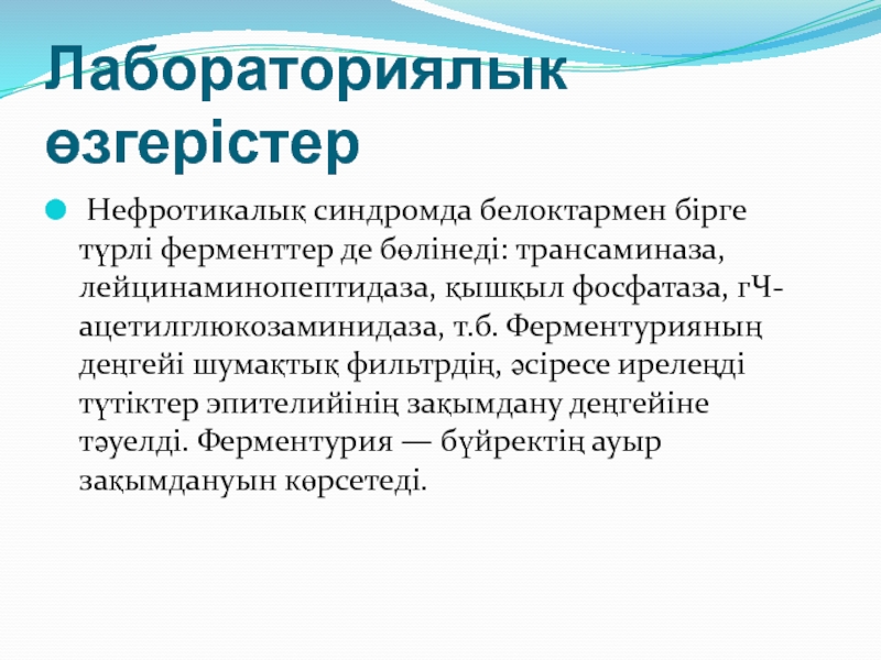 Нефротикалық синдромда белоктармен бірге түрлі ферменттер де бөлінеді: трансаминаза,