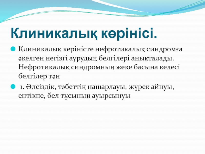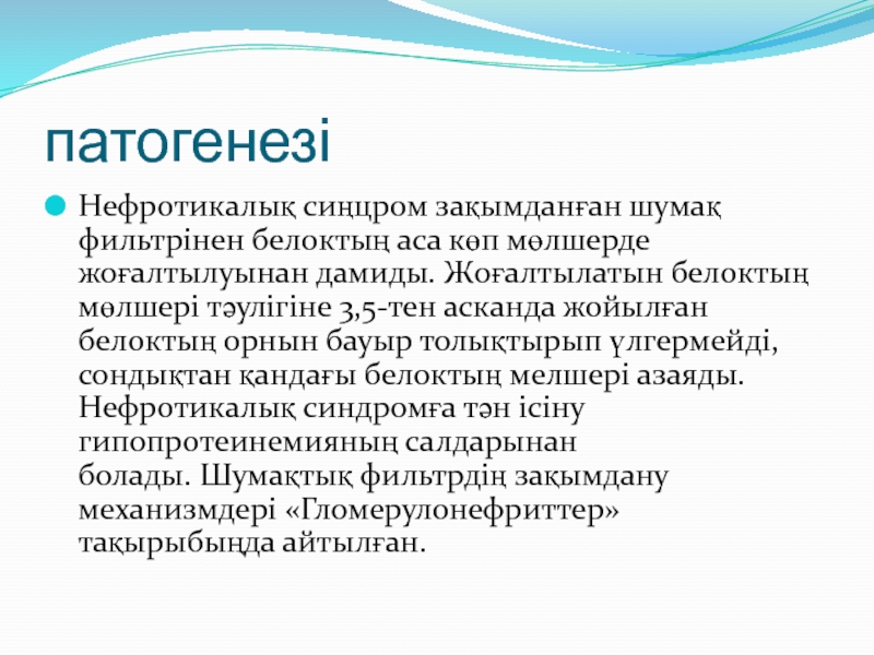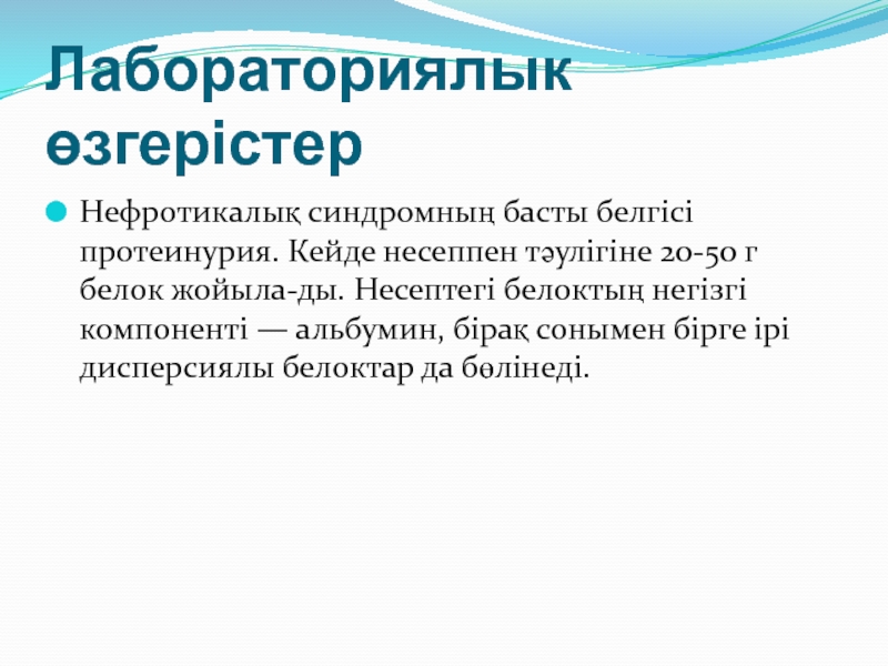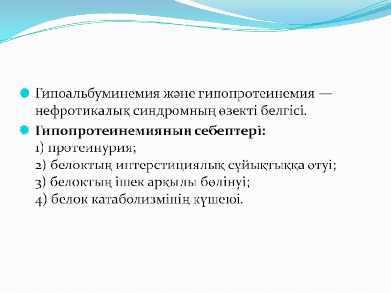 Слайд 15Гипоальбуминемия және гипопротеинемия — нефротикалық синдромның өзекті белгісі.