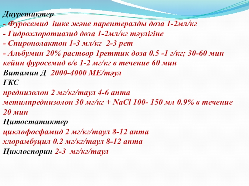 - Фуросемид ішке және парентералды доза 1-2мл/кг
