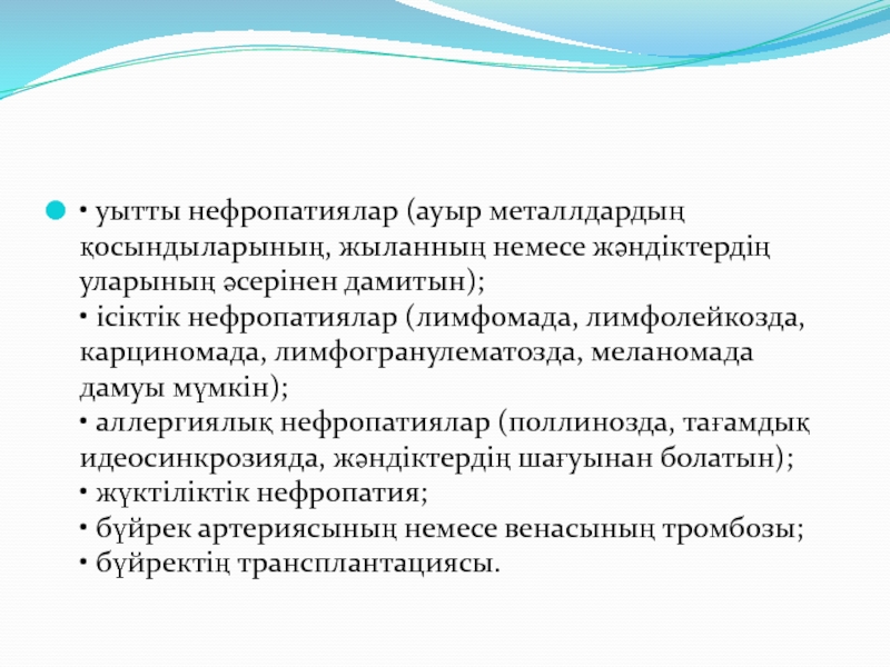 Слайд 7• уытты нефропатиялар (ауыр металлдардың қосындыларының, жыланның немесе жәндіктердің уларының