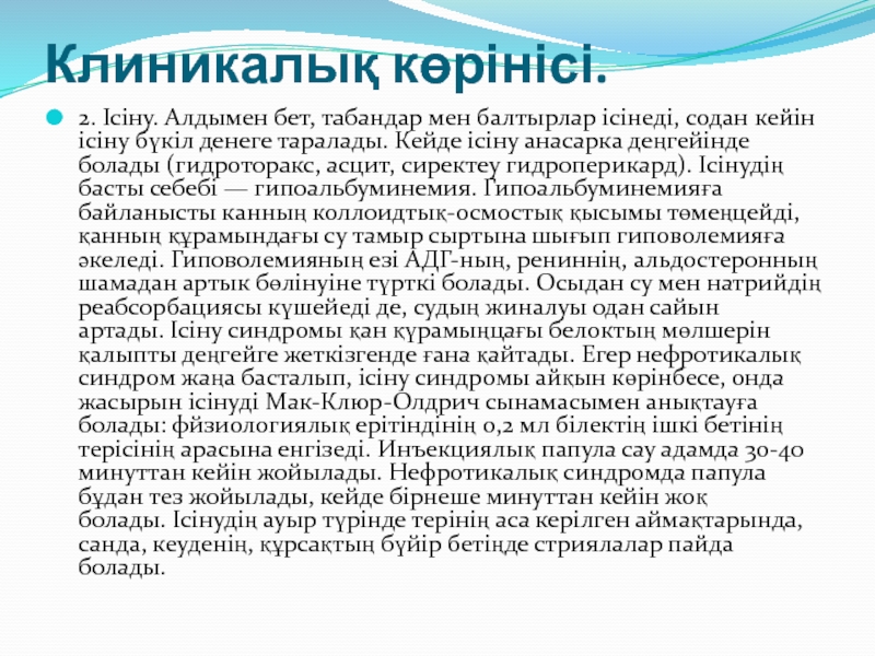(гидроторакс, асцит, сиректеу гидроперикард). Ісінудің басты себебі — гипоальбуминемия. Гипоальбуминемияға байланысты канның коллоидтық-осмостық қысымы төмеңцейді, қанның құрамындағы су тамыр сыртына шығып гиповолемияға әкеледі. Гиповолемияның езі АДГ-ның, рениннің, альдостеронның шамадан артык бөлінуіне түрткі болады. Осыдан су мен натрийдің реабсорбациясы күшейеді де, судың жиналуы одан сайын артады. Ісіну синдромы қан қүрамыңцағы белоктың мөлшерін қалыпты деңгейге жеткізгенде ғана қайтады. Егер нефротикалық синдром жаңа басталып, ісіну синдромы айқын көрінбесе, онда жасырын ісінуді Мак-Клюр-Олдрич сынамасымен анықтауға болады: фйзиологиялық ерітіндінің 0,2 мл білектің ішкі бетінің терісінің арасына енгізеді. Инъекциялық папула сау адамда 30-40 минуттан кейін жойылады. Нефротикалық синдромда папула бұдан тез жойылады, кейде бірнеше минуттан кейін жоқ болады. Ісінудің ауыр түрінде терінің аса керілген аймақтарында, санда, кеуденің, құрсақтың бүйір бетіңде стриялалар пайда болады.