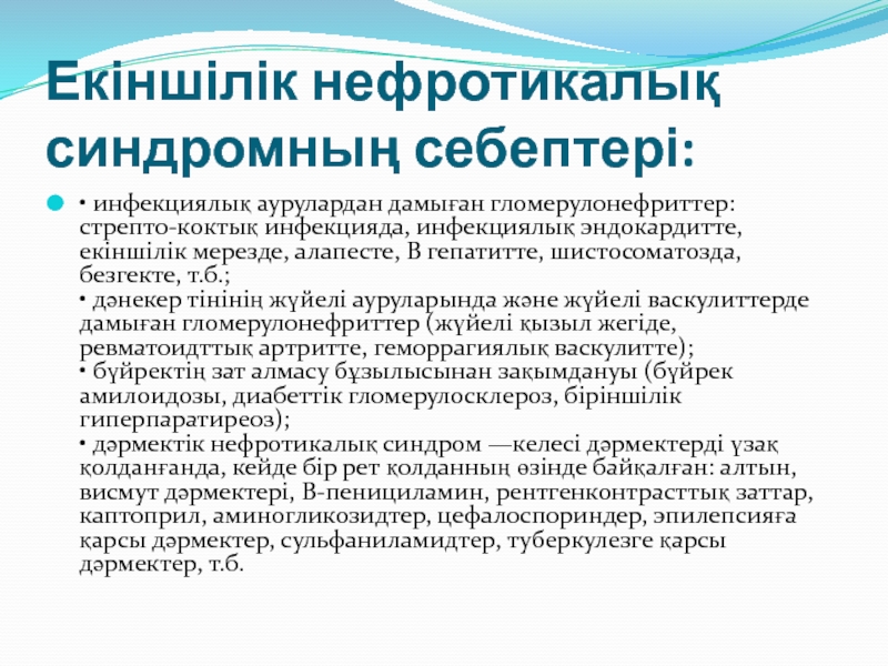 Слайд 6Екіншілік нефротикалық синдромның себептері: