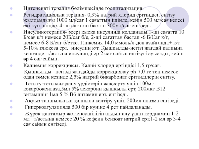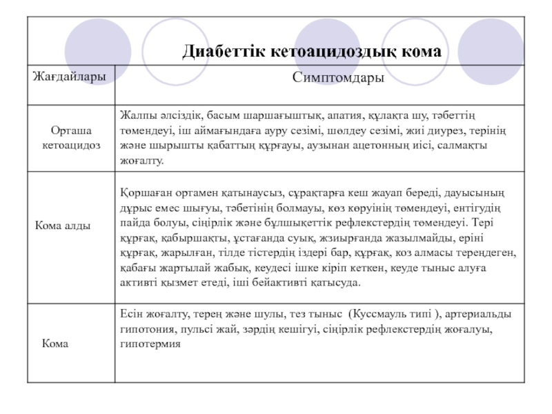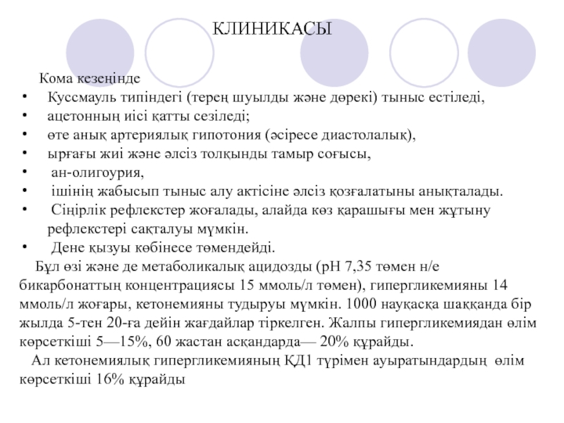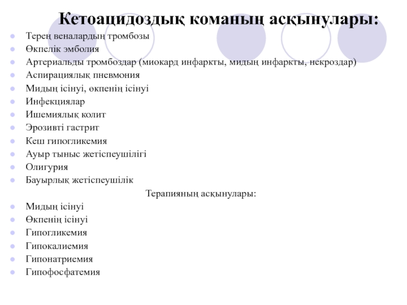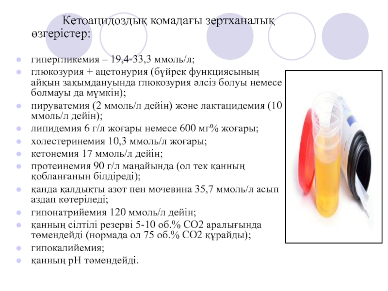 Бұл өзі және де метаболикалық ацидозды (рН 7,35 төмен н/е бикарбонаттың концентрациясы 15 ммоль/л төмен), гипергликемияны 14 ммоль/л жоғары, кетонемияны тудыруы мүмкін. 1000 науқасқа шаққанда бір жылда 5-тен 20-ға дейін жағдайлар тіркелген. Жалпы гипергликемиядан өлім көрсеткіші 5—15%, 60 жастан асқандарда— 20% құрайды.