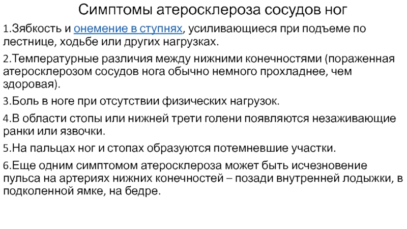 2.Температурные различия между нижними конечностями (пораженная атеросклерозом сосудов нога обычно немного прохладнее, чем здоровая).