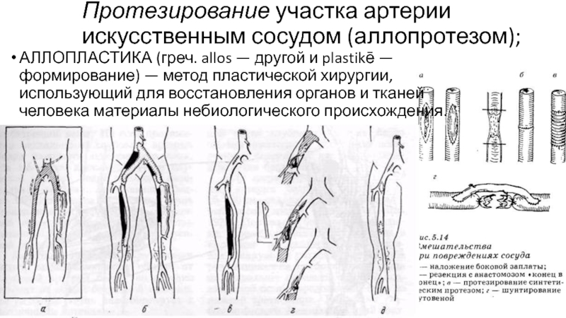 Слайд 16Протезирование участка артерии искусственным сосудом (аллопротезом);