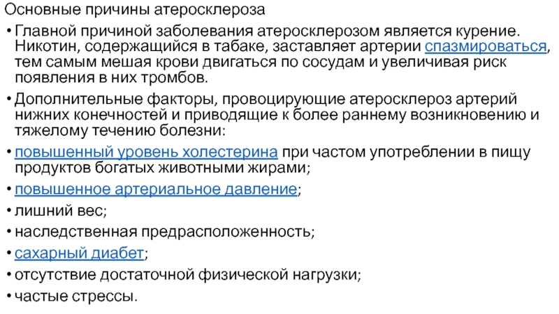 Дополнительные факторы, провоцирующие атеросклероз артерий нижних конечностей и приводящие к более раннему возникновению и тяжелому течению болезни: