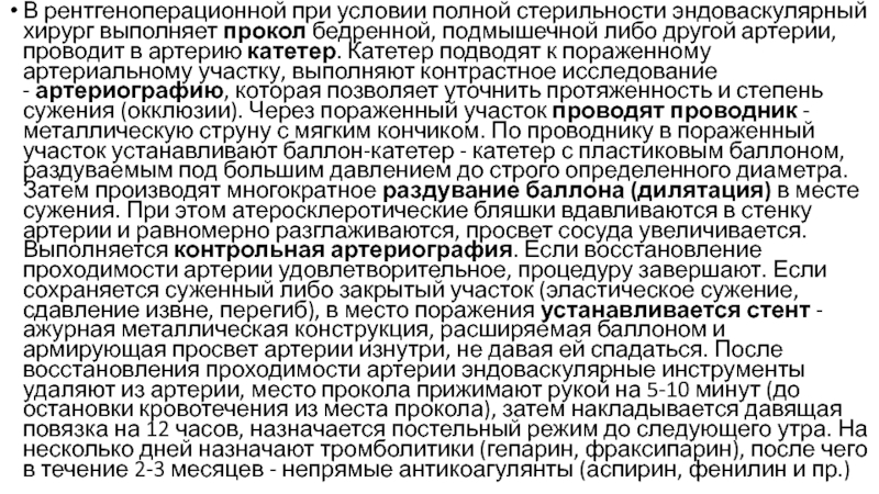 пораженному артериальному участку, выполняют контрастное исследование - артериографию, которая позволяет уточнить протяженность и степень сужения (окклюзии). Через пораженный участок проводят проводник - металлическую струну с мягким кончиком. По проводнику в пораженный участок устанавливают баллон-катетер - катетер с пластиковым баллоном, раздуваемым под большим давлением до строго определенного диаметра. Затем производят многократное раздувание баллона (дилятация) в месте сужения. При этом атеросклеротические бляшки вдавливаются в стенку артерии и равномерно разглаживаются, просвет сосуда увеличивается. Выполняется контрольная артериография. Если восстановление проходимости артерии удовлетворительное, процедуру завершают. Если сохраняется суженный либо закрытый участок (эластическое сужение, сдавление извне, перегиб), в место поражения устанавливается стент - ажурная металлическая конструкция, расширяемая баллоном и армирующая просвет артерии изнутри, не давая ей спадаться. После восстановления проходимости артерии эндоваскулярные инструменты удаляют из артерии, место прокола прижимают рукой на 5-10 минут (до остановки кровотечения из места прокола), затем накладывается давящая повязка на 12 часов, назначается постельный режим до следующего утра. На несколько дней назначают тромболитики (гепарин, фраксипарин), после чего в течение 2-3 месяцев - непрямые антикоагулянты (аспирин, фенилин и пр.)