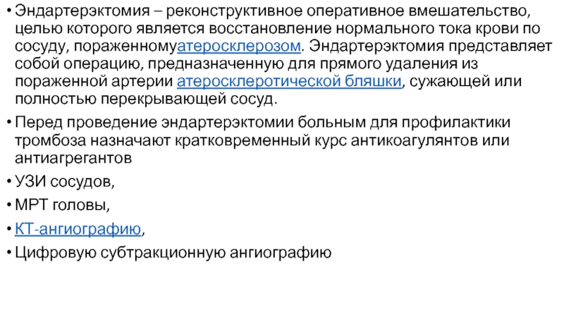 Слайд 19Эндартерэктомия – реконструктивное оперативное вмешательство, целью которого является восстановление нормального