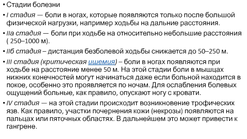 III стадия (критическая ишемия) – боли в ногах появляются при ходьбе на расстояние менее 50 м. На этой стадии боли в мышцах нижних конечностей могут начинаться даже если больной находится в покое, особенно это проявляется по ночам. Для ослабления болевых ощущений больные, как правило, опускают ногу с кровати.