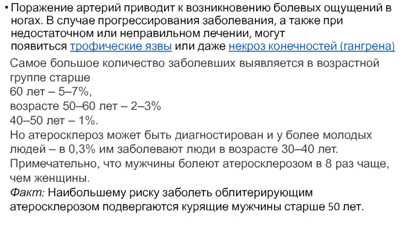 Факт: Наибольшему риску заболеть облитерирующим атеросклерозом подвергаются курящие мужчины старше 50 лет.