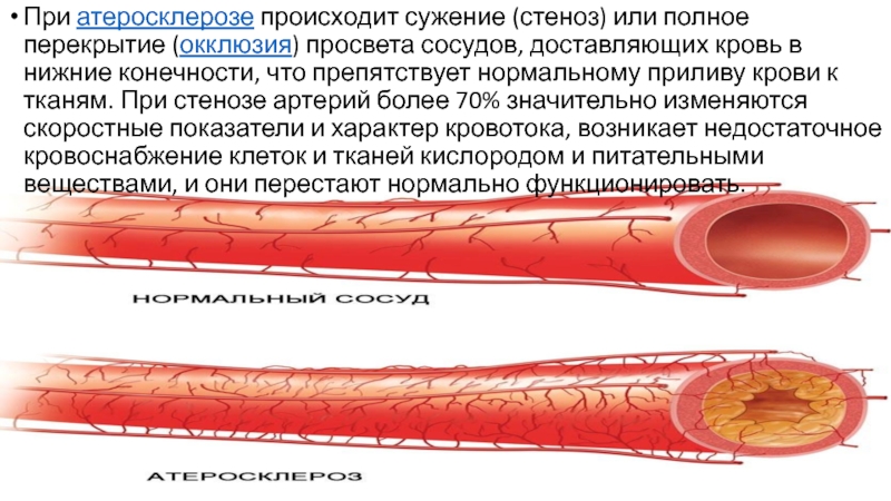 Слайд 3При атеросклерозе происходит сужение (стеноз) или полное перекрытие (окклюзия) просвета сосудов, доставляющих