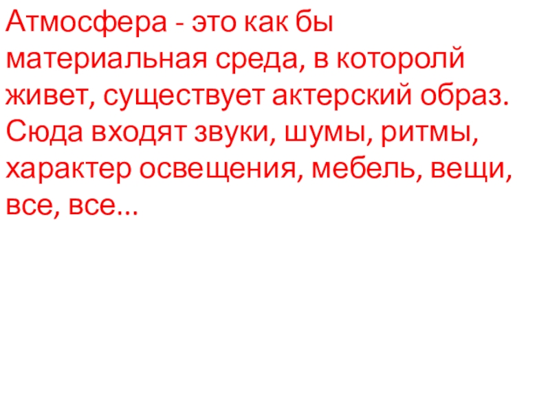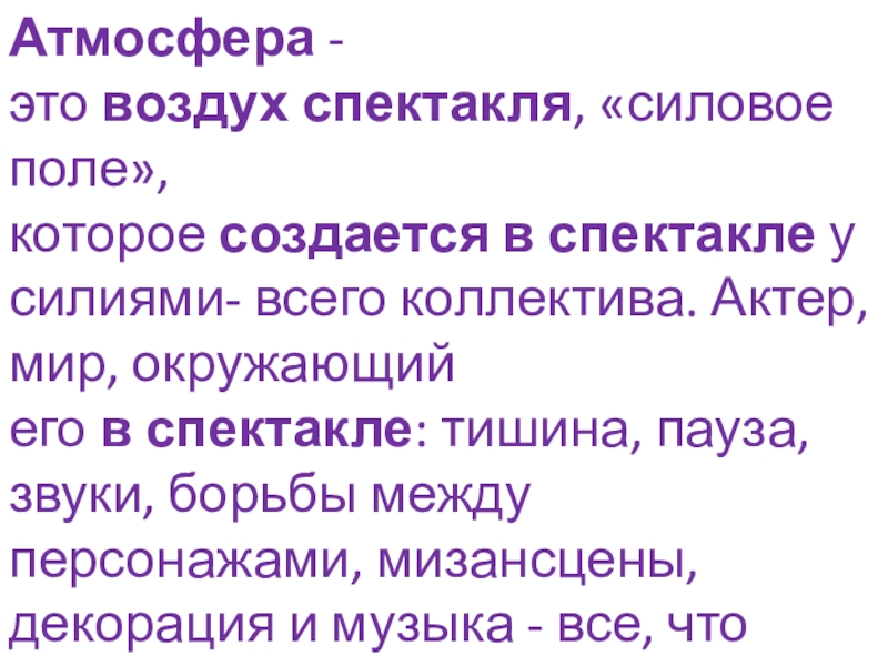 Слайд 2Атмосфера - это воздух спектакля, «силовое поле», которое создается в спектакле усилиями- всего коллектива. Актер, мир, окружающий