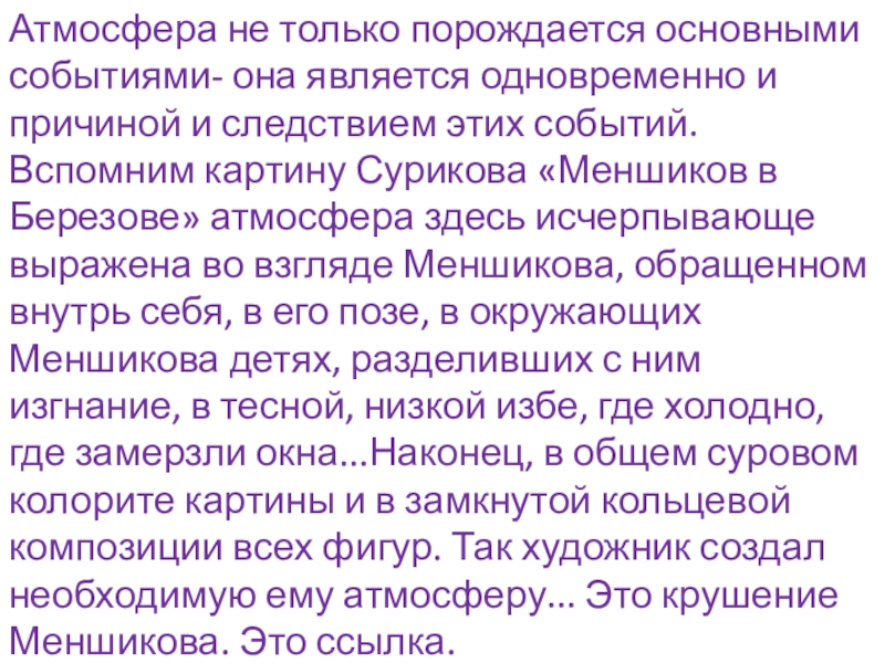 атмосфера здесь исчерпывающе выражена во взгляде Меншикова, обращенном внутрь себя, в его позе, в окружающих Меншикова детях, разделивших с ним изгнание, в тесной, низкой избе, где холодно, где замерзли окна...Наконец, в общем суровом колорите картины и в замкнутой кольцевой композиции всех фигур. Так художник создал необходимую ему атмосферу... Это крушение Меншикова. Это ссылка.