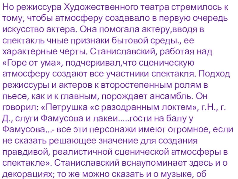 чные признаки бытовой среды., ее характерные черты. Станиславский, работая над «Горе от ума», подчеркивал,что сценическую атмосферу создают все участники спектакля. Подход режиссуры и актеров к второстепенным ролям в пьесе, как и к главным, порождает ансамбль. Он говорил: «Петрушка «с разодранным локтем», г.Н., г.Д., слуги Фамусова и лакеи.....гости на балу у Фамусова...- все эти персонажи имеют огромное, если не сказать решающее значение для создания правдивой, реалистичной сценической атмосферы в спектакле». Станиславский вснаупоминает здесь и о декорациях; то же можно сказать и о музыке, об освещении, о богатой гамме сценических звуков.