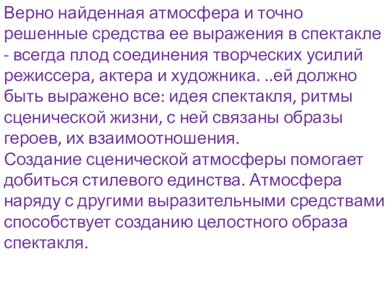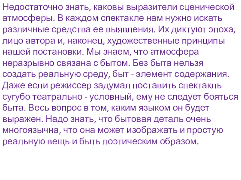 Слайд 20Недостаточно знать, каковы выразители сценической атмосферы. В каждом спектакле нам