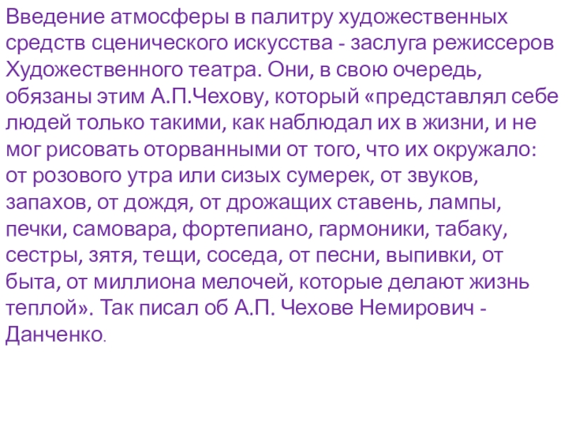 который «представлял себе людей только такими, как наблюдал их в жизни, и не мог рисовать оторванными от того, что их окружало: от розового утра или сизых сумерек, от звуков, запахов, от дождя, от дрожащих ставень, лампы, печки, самовара, фортепиано, гармоники, табаку, сестры, зятя, тещи, соседа, от песни, выпивки, от быта, от миллиона мелочей, которые делают жизнь теплой». Так писал об А.П. Чехове Немирович - Данченко.