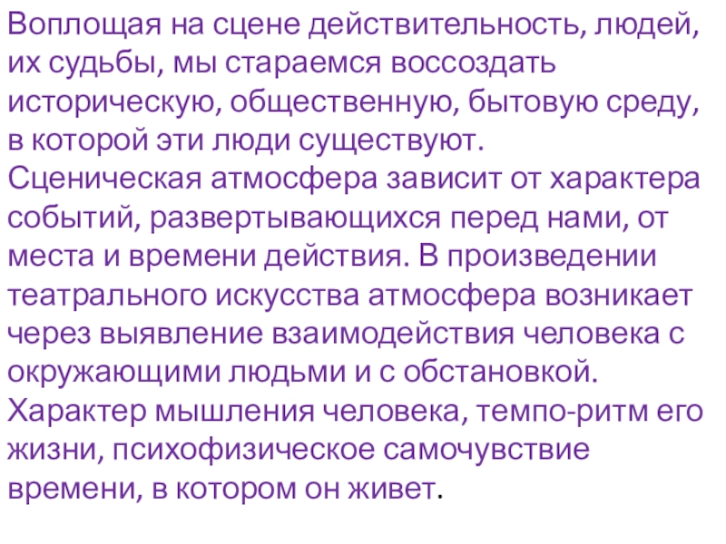 зависит от характера событий, развертывающихся перед нами, от места и времени действия. В произведении театрального искусства атмосфера возникает через выявление взаимодействия человека с окружающими людьми и с обстановкой. Характер мышления человека, темпо-ритм его жизни, психофизическое самочувствие времени, в котором он живет.