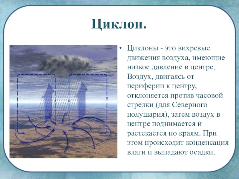 Циклон.Циклоны - это вихревые движения воздуха, имеющие низкое давление в центре. Воздух, двигаясь от периферии к центру,