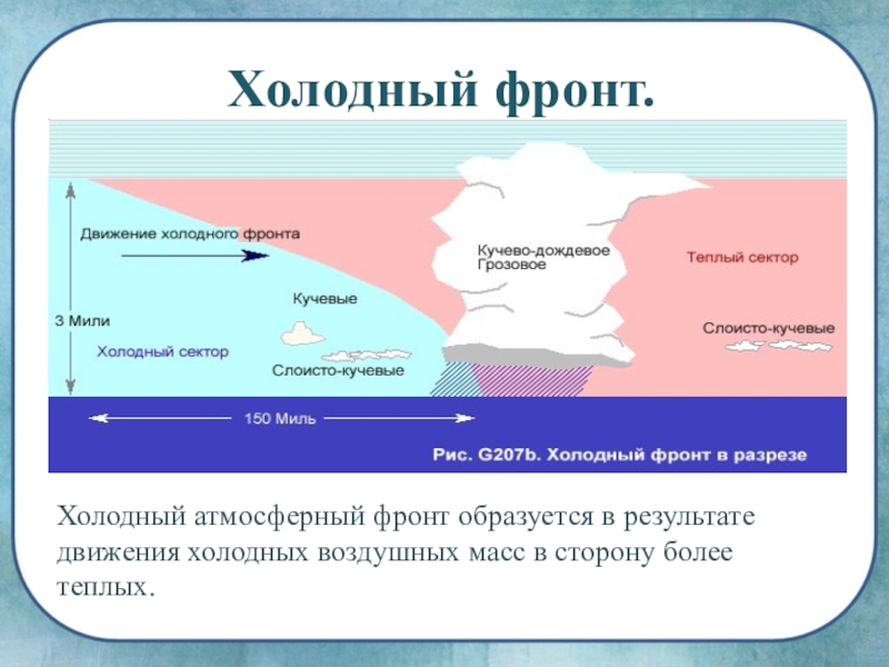 Холодный фронт.Холодный атмосферный фронт образуется в результате движения холодных воздушных масс в сторону более теплых.