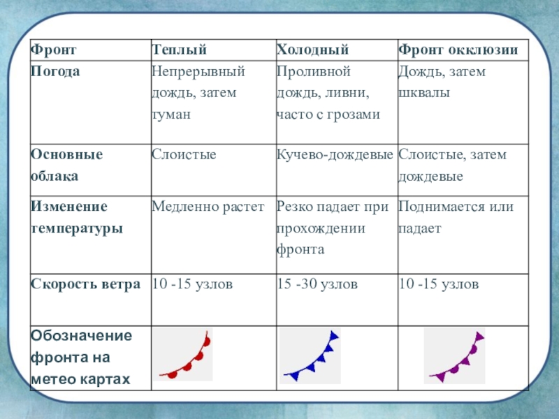 2. Охарактеризовать теплый и холодный фронты. Погоду, которую