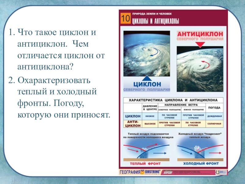 1. Что такое циклон и антициклон. Чем отличается циклон от антициклона? 2. Охарактеризовать теплый и холодный
