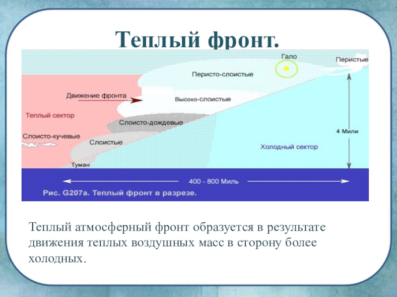 Теплый фронт.Теплый атмосферный фронт образуется в результате движения теплых воздушных масс в сторону более холодных.