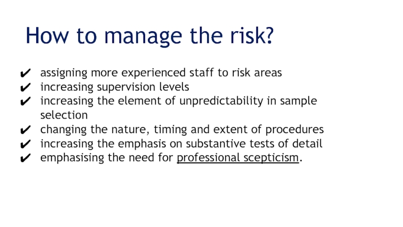 acceptably low level is to lower detection risk. This means that the risk of the auditors not finding a misstatement needs to be low.