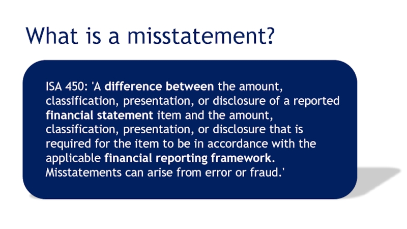 and the amount, classification, presentation, or disclosure that is required for the item to be in accordance with the applicable financial reporting framework. Misstatements can arise from error or fraud.'
