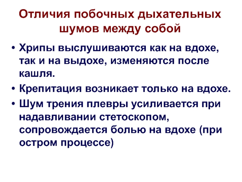 Слайд 14Отличия побочных дыхательных шумов между собой
