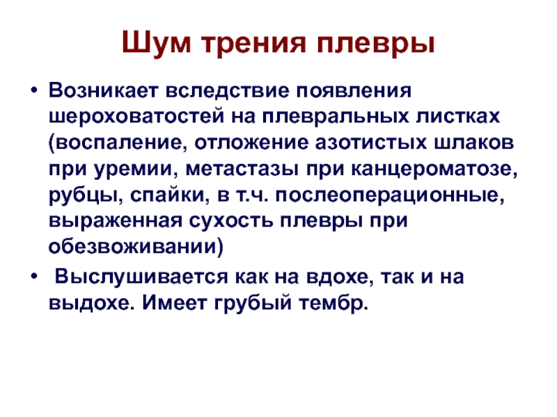 Возникает вследствие появления шероховатостей на плевральных листках (воспаление,