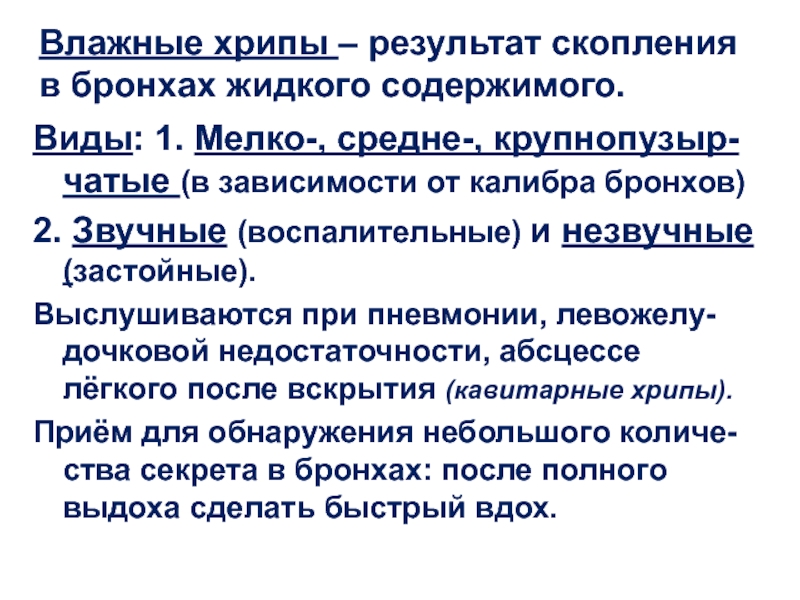 Слайд 11Влажные хрипы – результат скопления в бронхах жидкого содержимого.