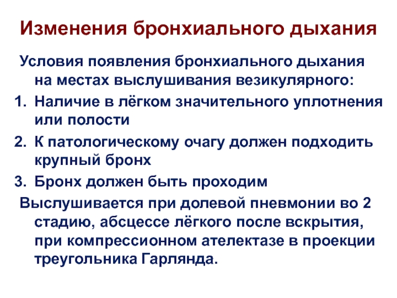 Условия появления бронхиального дыхания на местах выслушивания