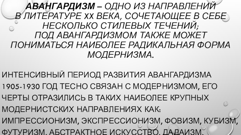 Слайд 2Авангардизм – одно из направлений в литературе XX века, сочетающее в себе несколько