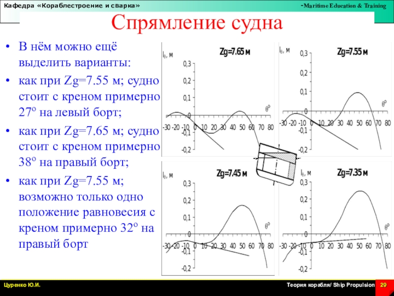 как при Zg=7.55 м; возможно только одно положение равновесия с креном примерно 32о на правый борт