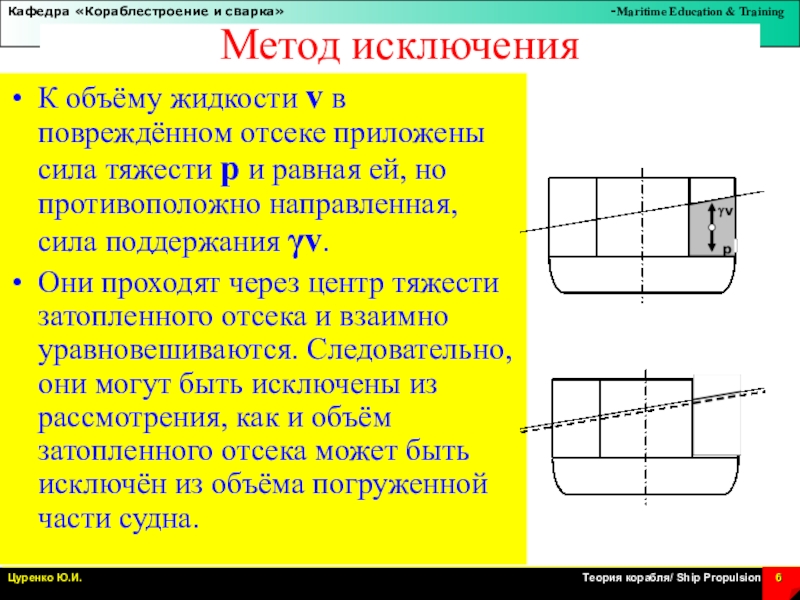 Они проходят через центр тяжести затопленного отсека и взаимно уравновешиваются. Следовательно, они могут быть исключены из рассмотрения, как и объём затопленного отсека может быть исключён из объёма погруженной части судна.