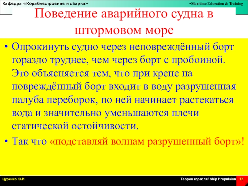 Слайд 17Поведение аварийного судна в штормовом море