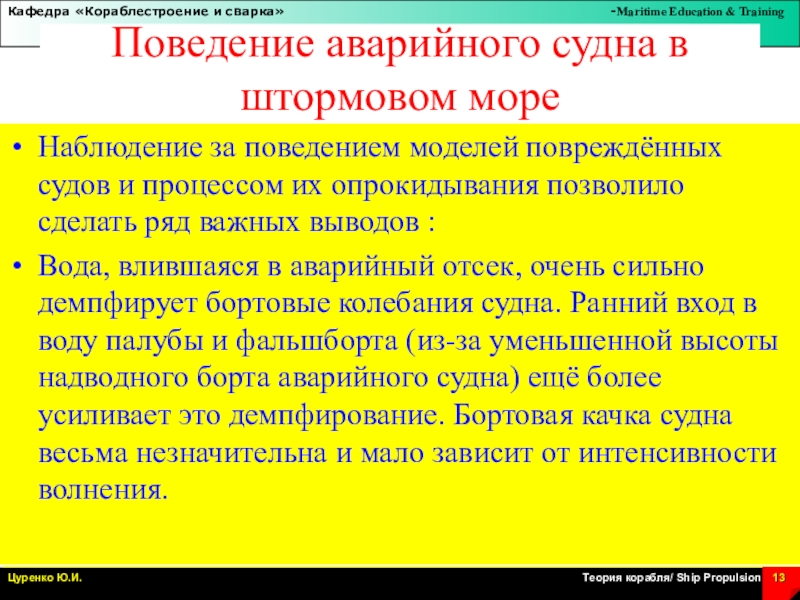 Слайд 13Поведение аварийного судна в штормовом море