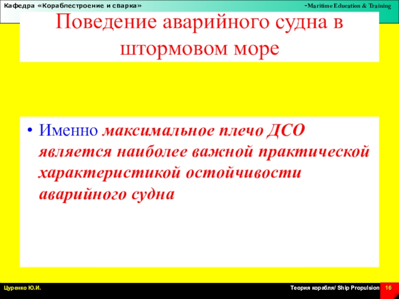 Слайд 16Поведение аварийного судна в штормовом море