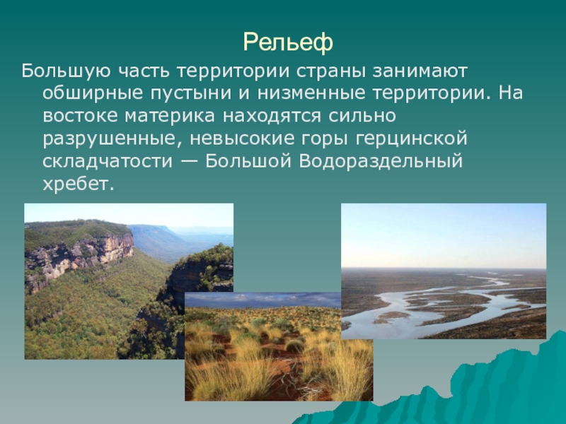 РельефБольшую часть территории страны занимают обширные пустыни и низменные территории. На востоке материка находятся сильно разрушенные, невысокие