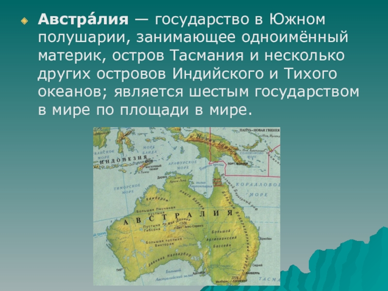 Австра́лия — государство в Южном полушарии, занимающее одноимённый материк, остров Тасмания и несколько других островов Индийского и Тихого океанов; является шестым государством в мире по площади в мире.