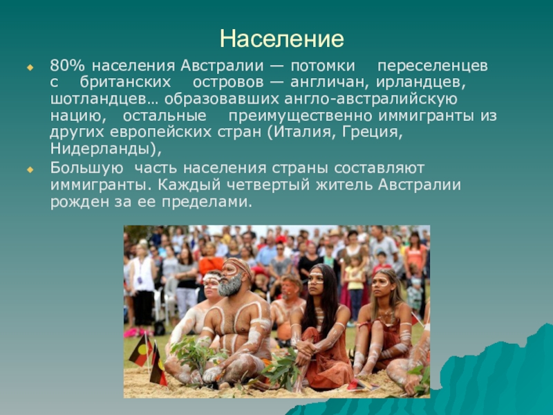 Население80% населения Австралии — потомки  переселенцев  с  британских  островов — англичан, ирландцев, шотландцев…